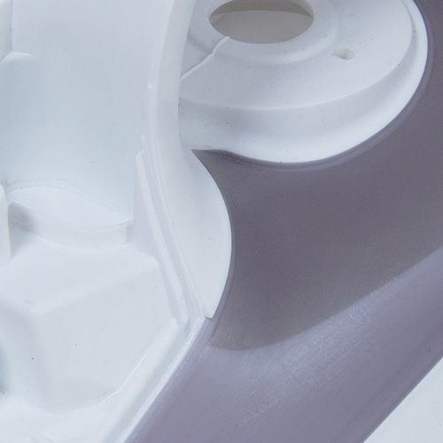 二色成形(2色成形)はダブルモールドとも言われ1台の成形機で2種類の樹脂を熱融着するので、成形サイクルのバラツキがなく、安定した製品品質を得られます。